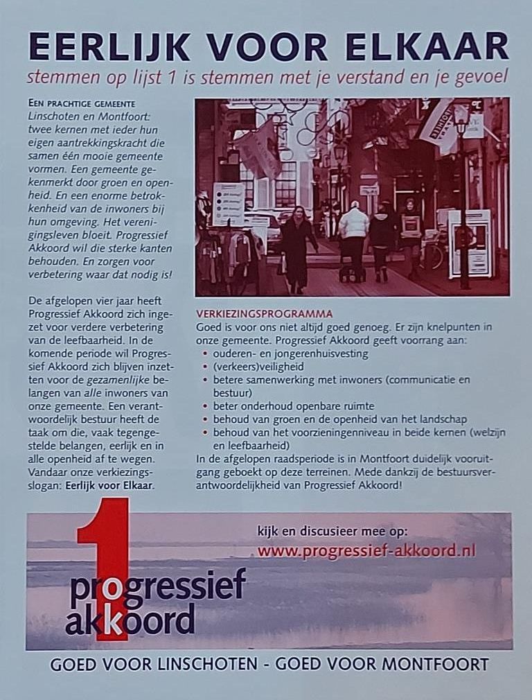 Terwijl de wereld om hen heen verandert, heeft Progressief Akkoord in Montfoort/Linschoten de brug geslagen tussen het verleden en de toekomst. Ze hebben bewezen dat vooruitstrevende politiek niet in strijd hoeft te zijn met traditie. In plaats daarvan hebben ze de twee in harmonie gebracht, waarbij trots zijn op het erfgoed maar ook enthousiast zijn over de kansen van morgen heel goed samen kunnen gaan.