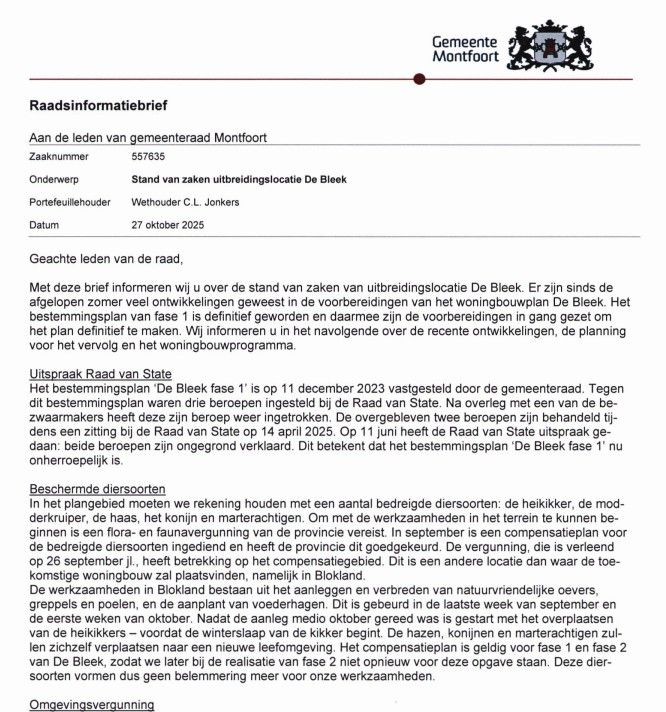 De Bleek had hét voorbeeld kunnen zijn van een toekomstbestendige wijk die jong en oud, huurder en koper verbindt. In plaats daarvan wordt fase 1 een wijk waar vooral de Randstad van profiteert. Dit college van CDA, Lokaal Montfoort, SPG en CU, heeft met De Bleek een unieke kans laten liggen om de lokale woningmarkt in balans te brengen.