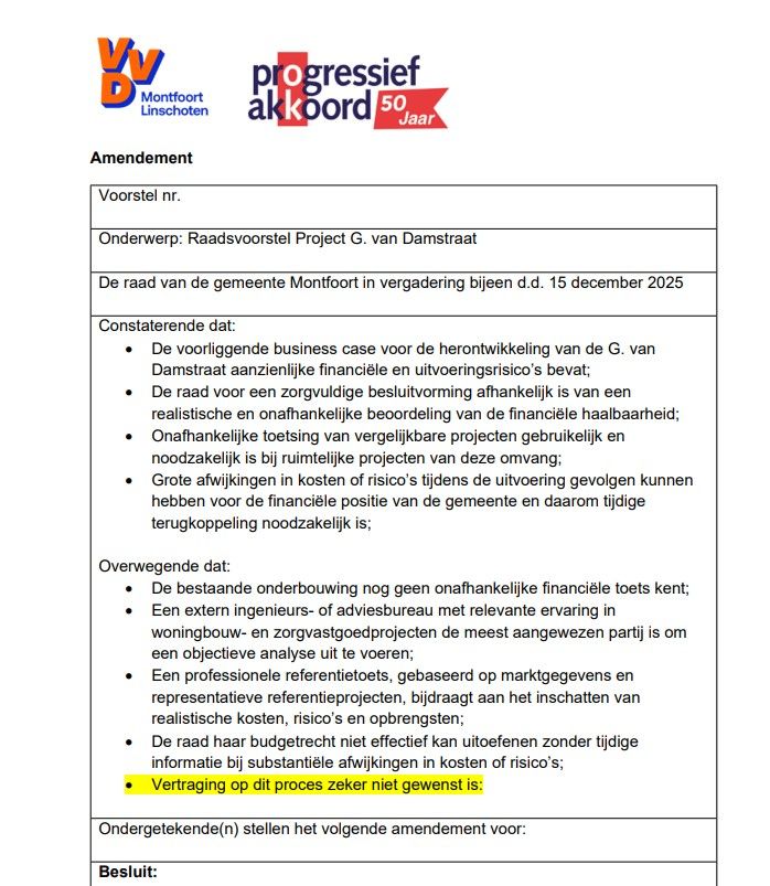 Het amendement van Progressief Akkoord en VVD kiest nadrukkelijk niet voor vertraging. Integendeel: door nu een onafhankelijke toets te laten uitvoeren, voorkomt de raad dat zij later – bij het vaststellen van het uitvoeringskrediet – voor voldongen feiten komt te staan. Het amendement borgt dat de raad tijdig inzicht krijgt in: